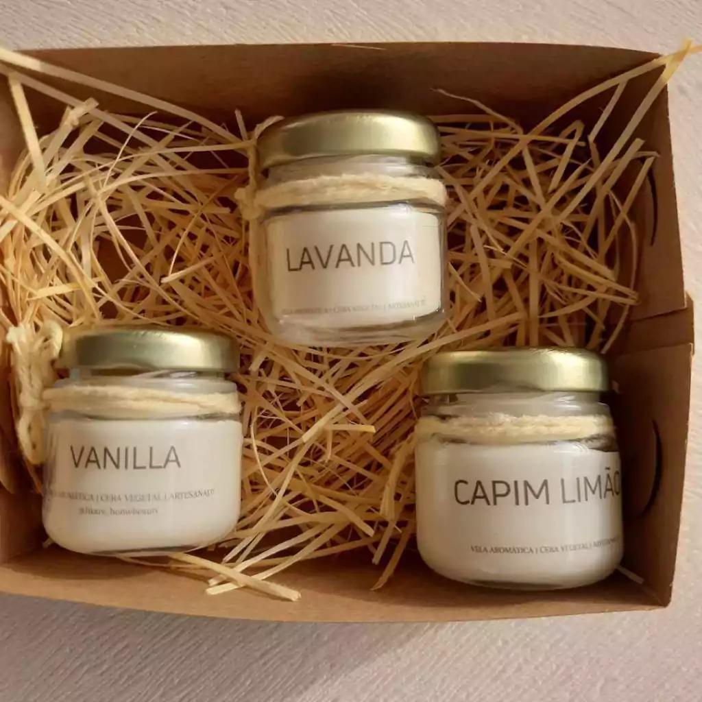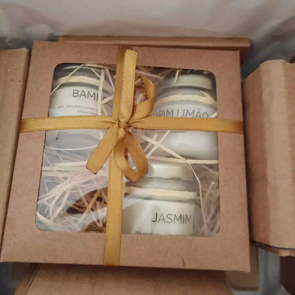 Nessa compra você estará addqurindo uma caixa presente com 3 mini velas de 40g cada. A caixa é kraft com visor de acetato. A fita/laço é de tecido. A cor e modelo da caixa e laço podem variar conforme disponibilidade, mas sempre estarão muito bem apresentadas.