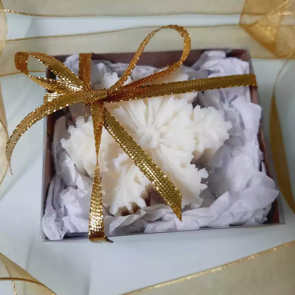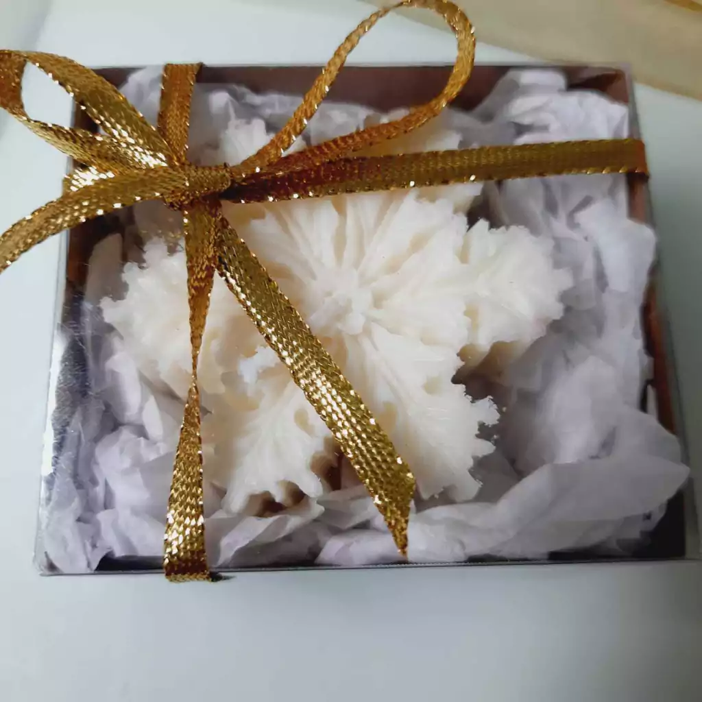 Essa é uma vela aromática em forma de Floco de Neve, embalada especialmente para presentear, se presentear e para lembrancinhas.